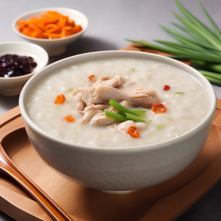 A delightful bowl of creamy chicken congee topped with fresh herbs and crispy shallots, offering a unique combination of flavors and textures for a comforting meal.