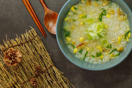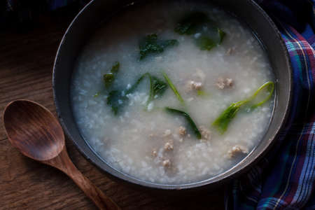 Rice porridge with pork put on old wooden table, rustic food, image dark tone
