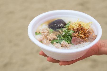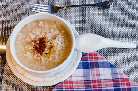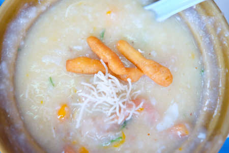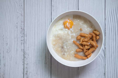 Thai pork congee or porridge topping with boiled egg and mini dough. Asian rice porridge