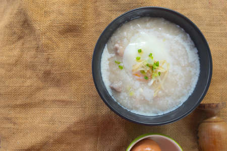 Close-up Pork Congee with Soft-boiled eggs is Asian breakfast. Food background