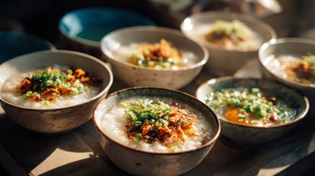 A collection of inviting bowls filled with creamy rice porridge, garnished with green onion and crispy toppings, beautifully lit for a cozy dining experience.