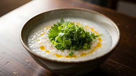Experience a mouthwatering bowl of rice porridge topped with fresh herbs and spices. Perfect for a comforting meal any time of day.