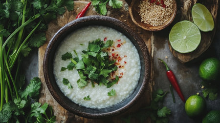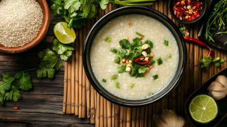 A traditional Thai setting with a bowl of rice porridge placed on a bamboo mat, accompanied by fresh ingredients like coriander and lime, creating a rustic look.