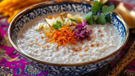 A beautifully presented bowl of creamy rice porridge topped with fresh cilantro, grated carrots, and sesame seeds. Perfect for a healthy breakfast.