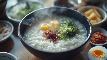 A steamy, comforting bowl of rice porridge on a cold, misty morning, with side dishes of salted eggs, pickled radish, and spicy chili paste completing the scene.