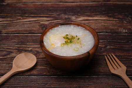 Nutritious rice porridge with soft boiled egg and spring onion in wooden bowl for breakfast or light meal.