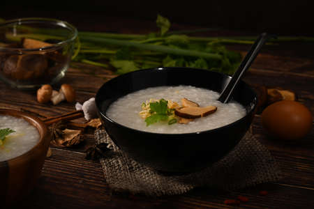 Congee or rice porridge with shiitake mushroom, slice ginger and scallion on wood table.