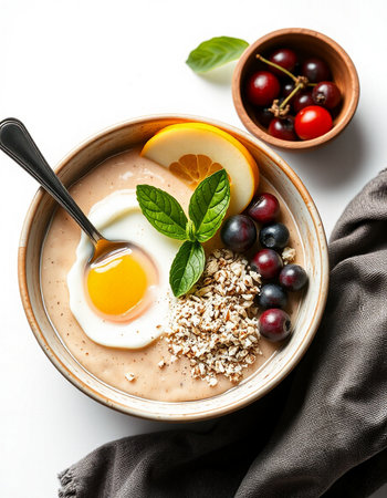 Healthy breakfast bowl with oatmeal, berries and egg on white background