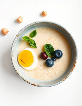 Oatmeal porridge with berries and egg in a bowl on a white background