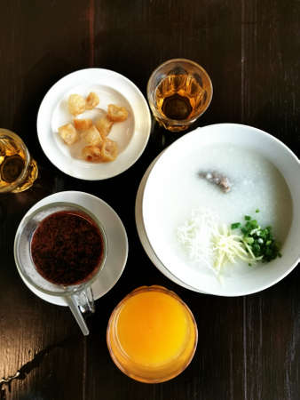 congee, rice porridge, chinese cruller with coffee and tea, orange juice, breakfast on wood table