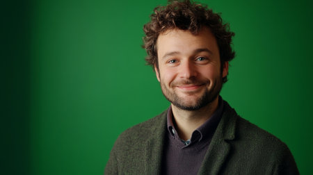 Portrait of handsome middle-aged man smiling and looking at camera against green background.