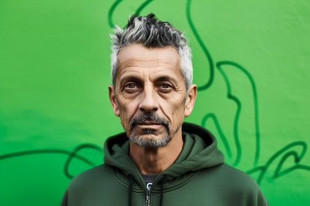 portrait of senior man in hoodie looking at camera on green