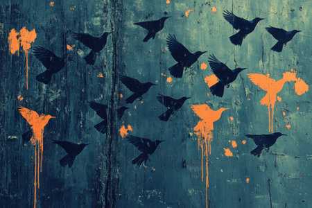 Mural showcases black bird silhouettes in flight against a blue textured wall, accented by orange paint splatters, evoking an urban artistic vibe