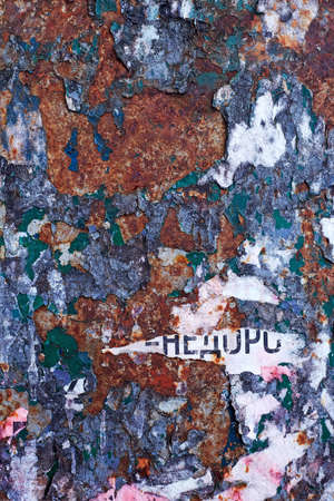 Close-up of a weathered wall with layers of torn posters and peeling paint, revealing fragments of a woman's face.