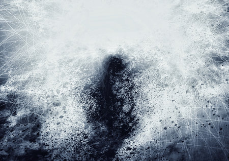 Paintography. Double exposure of woman's portrait dissolving into patterns and shapes, black and white
