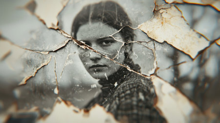 A young woman is depicted with a serious expression, her image partially obscured by cracks in an old surface. The atmosphere conveys a sense of history and nostalgia.