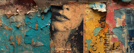 Close-up of a weathered wall with layers of torn posters and peeling paint, revealing fragments of a woman's face.