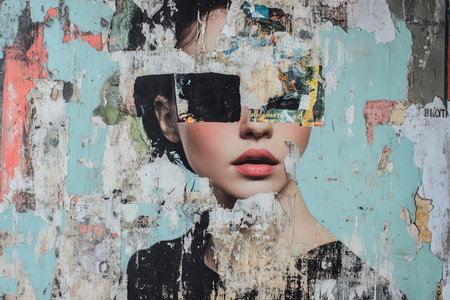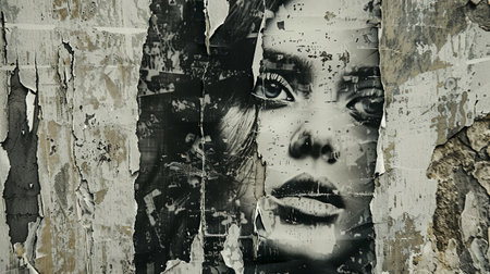A close-up of a woman's face partially covered by a ripped poster on a weathered wall.