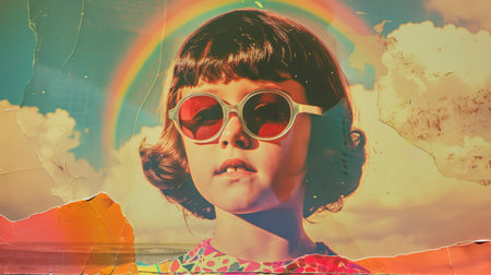 Portrait of cute little girl in sunglasses on the background of the rainbow