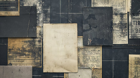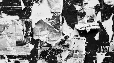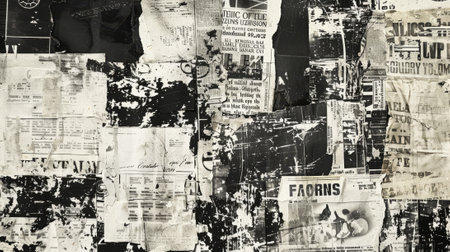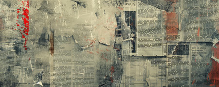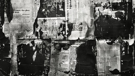 A grunge texture background with layered newspaper clippings, torn edges, and faded print, conveying a chaotic and urban vibe.
