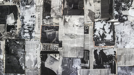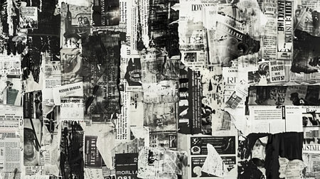 A collage of newspaper clippings with a black and white background. Scene is chaotic and disorganized