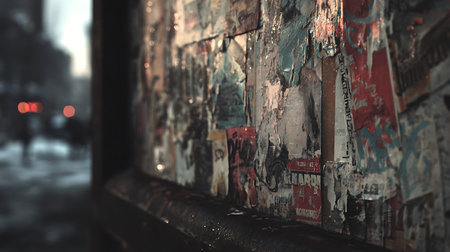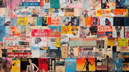 Artistic Urban Street Background with Grungy Wall with Ripped, Torn And Peeled Posters. Old Wall with Scratched Advertising. Old Billboard with Torn Posters. Vintage Wide Background and Texture.
