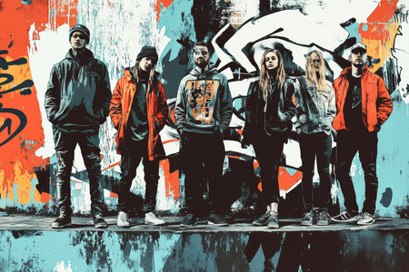 Against an abstract urban canvas, a diverse group of young Europeans showcases contemporary street culture, embodying the spirit of community and artistic freedom.