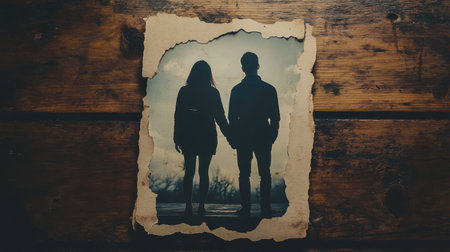 A beautiful silhouette of a couple holding hands, set against a textured wooden background, capturing the essence of love and connection in a nostalgic and artistic way.