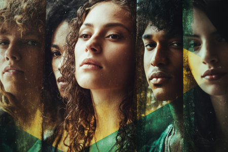 Conceptual photo-collage for Brazil Independence Day, featuring faces of diverse Brazilians: layered with fragments of the national flag