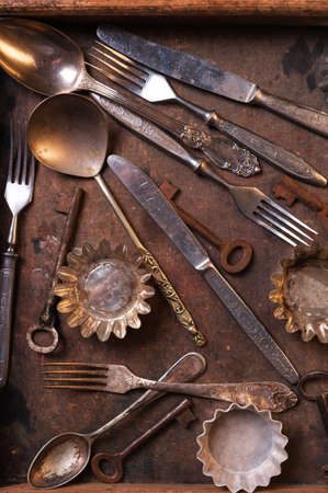 Old cutlery and keys in a wooden box
