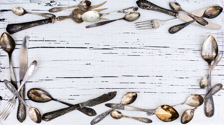 Old antique silverware,top view, selective focus