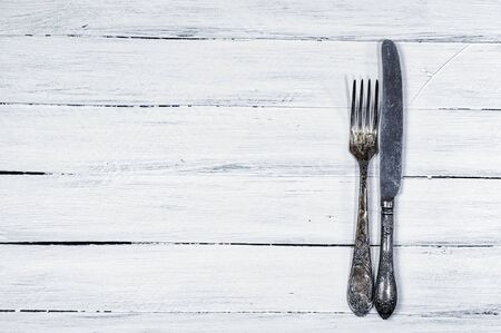 white wooden background with cutlery, vintage fork and knife