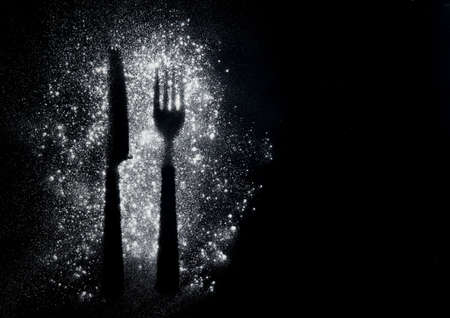 Imprint fork and knife made of flour on a black