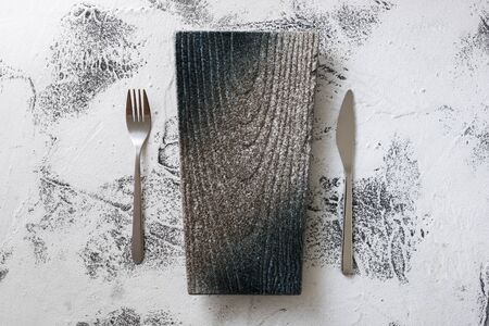 Blank gray stoned table with dishes fork and knife. Food invitation. Ready to serve and cook fresh meal. Copy empty space. Top view - flat lay
