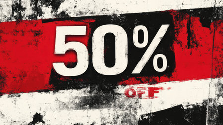 A bold SALE banner with 50 OFF in striking black text on a vibrant red stripe, set against a clean textured black-and-white background for impact.
