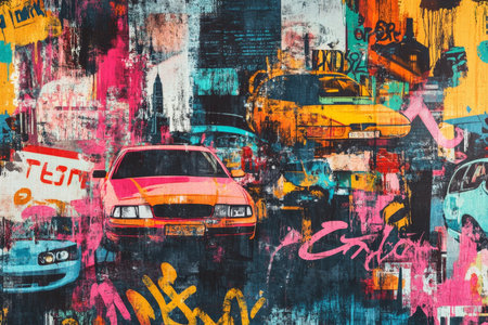 Vibrant urban graffiti design with city elements, street signs, and bold brushstroke accents