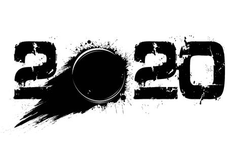Abstract numbers 2020 and hockey puck made of blots in grunge style. 2020 New Year on an isolated background. Design pattern. Vector illustration