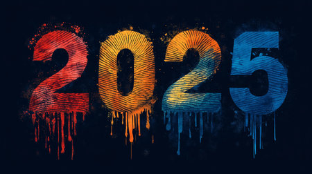 Colorful digits for 2025 feature artistic paint drips, celebrating the New Year in a vibrant way, evoking excitement and anticipation.