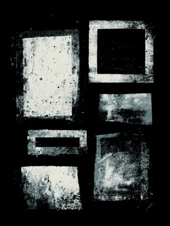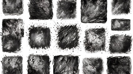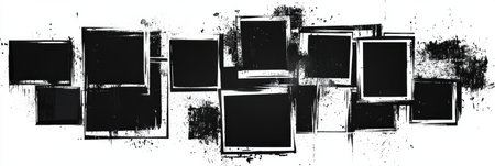Rough edge black rectangles and grunge squares are arranged creatively for artistic design projects and collage applications.