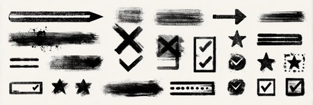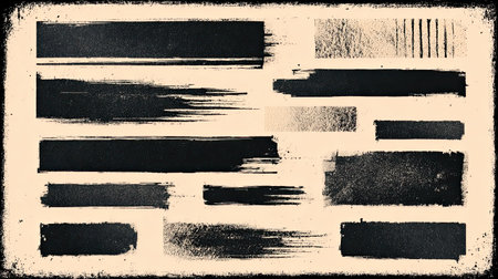 A collection of black brush strokes and graphic symbols arranged in a visually engaging layout, suitable for various design and artistic applications.