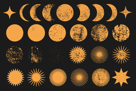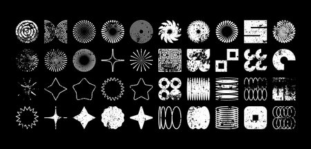 Brutalist geometric shapes, modern grunge symbols. Simple primitive elements and forms, distressed details. Retro design, aged, vintage, trendy contemporary minimalist style, y2k. Vector illustration