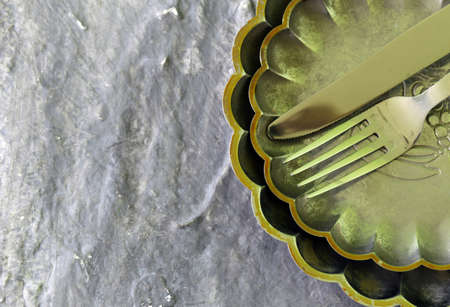 Blank gray stoned table with dishes fork and knife. Food invitation. Ready to serve and cook fresh meal. Copy empty space. Top view - flat lay