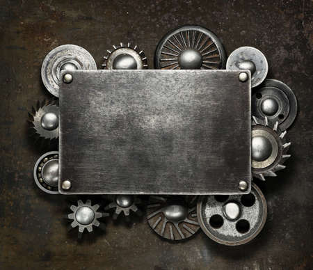 old vintage nameplate on rusty iron background, scratched and weathered, blank space for text