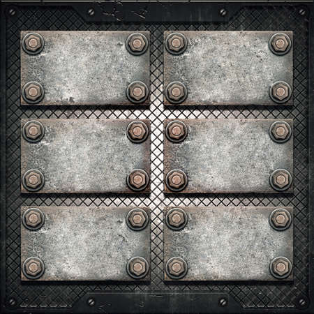 Rusty black metal plate with screws isolated on white background. 3d illustration
