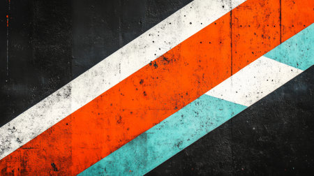 Grungy abstract geometric mural with red, blue, and white diagonal stripes on a dark worn wall. Urban street art and modern design concept
