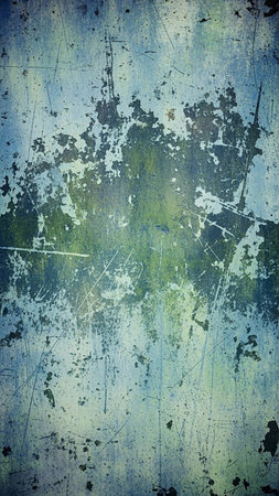 A grunge abstract background featuring a distressed weathered metal surface with peeling paint, scratches, and cracks in shades of blue and green.