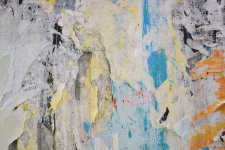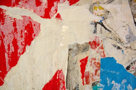 Red, yellow and blue torn, crumpled and peeling paper placards and posters on street wall billboard with rough surface texture background.
