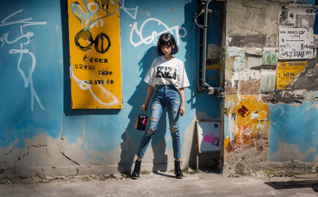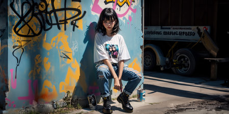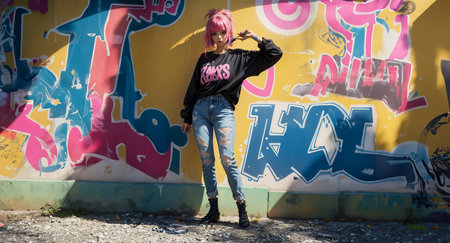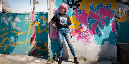 Outdoor portrait of a teen girl with teal green hair streak wearing a denim jacket with shamrock patch, standing by a graffiti wall. Youth culture and street style concept.