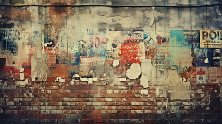 Artistic Urban Street Background with Grungy Wall with Ripped, Torn And Peeled Posters. Old Wall with Scratched Advertising. Old Billboard with Torn Posters. Vintage Wide Background and Texture.