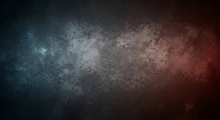A dark, textured background with an abstract composition of glowing elements. Swirls of blue and grey are visible on the left, transitioning to reddish-orange hues on the right, resembling cosmic clouds or a distressed painted surface.